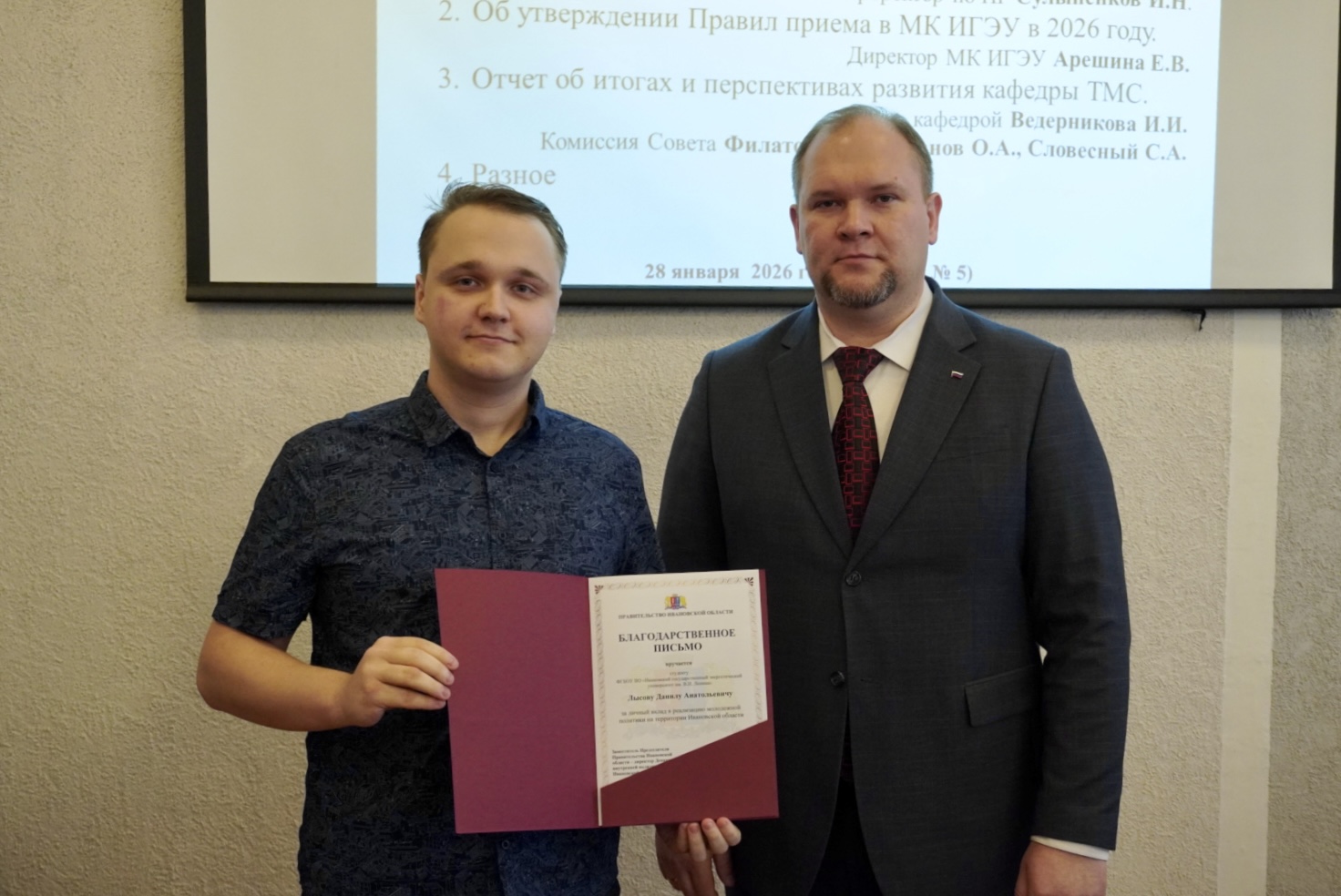 − студенту ИГЭУ Лысову Данилу - гр. 1-23М за личный вклад в реализацию молодежной политики на территории Ивановской области.