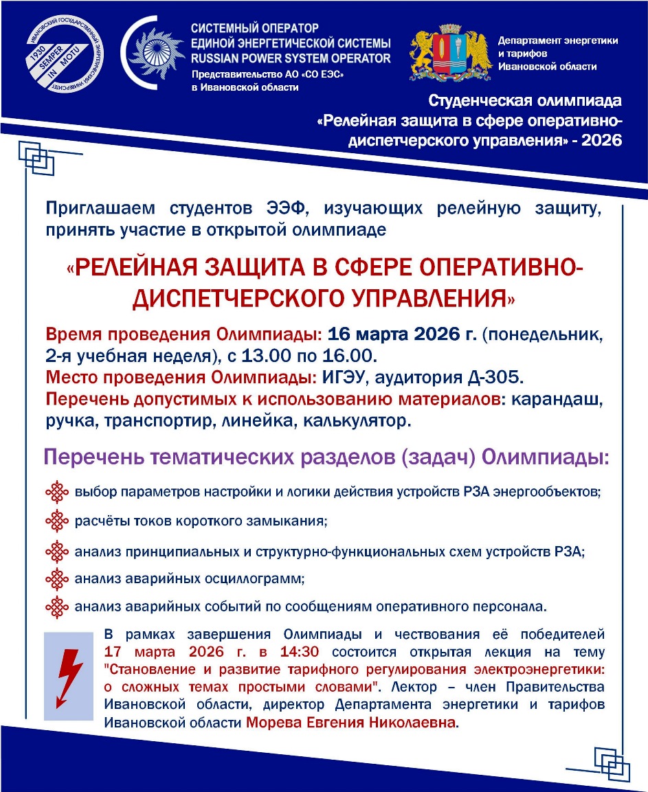 В рамках завершения Олимпиады и чествования её победителей 17 марта 2026 г. в 14:30 состоится открытая лекция на тему «Становление и развитие тарифного регулирования электроэнергетики: о сложных темах простыми словами».