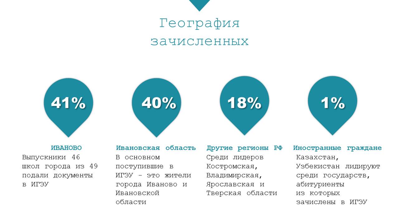 География абитуриентов ИГЭУ всегда была довольно обширной, текущий год в этом отношении не сильно отличается от предыдущих, в общежития энергоуниверситета заселяются первокурсники из 29 регионов Российской Федерации. Тем не менее, основной контингент поступивших в ИГЭУ это ивановцы (41%) и жители Ивановской области (39%).