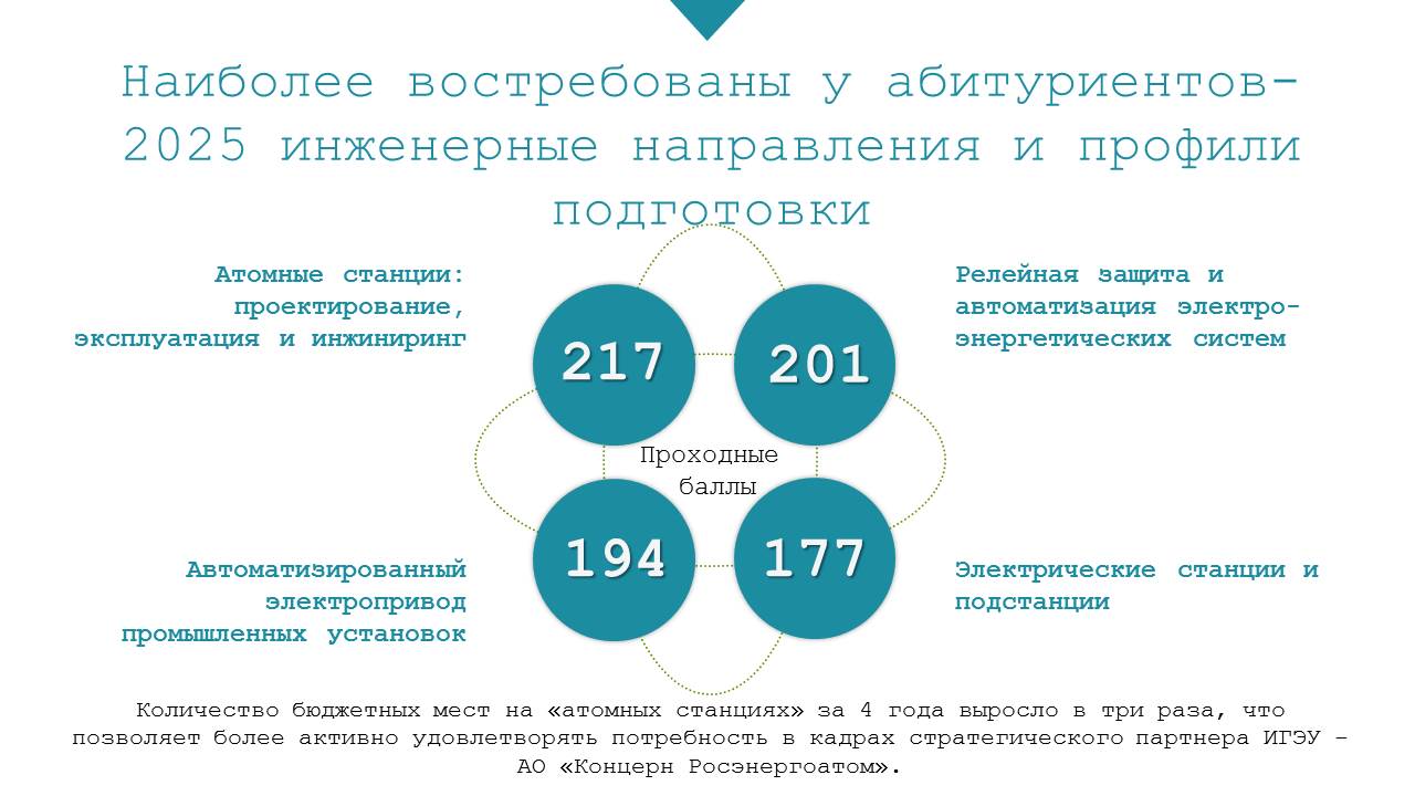 Рост конкурса повлек за собой и рост проходных баллов, особенно заметный на инженерно-технических направлениях подготовки, таких как «Электроэнергетика и электротехника» и «Теплоэнергетика и теплотехника». Естественно, что вырос и средний балл зачисленных по результатам ЕГЭ (67,9) Другое следствие увеличения спроса на техническое и, в частности, энергетическое образование среди абитуриентов – рост количества ребят, поступивших в ИГЭУ на платной основе. Набор «контрактников» по сравнению с 2024 годом вырос более чем в три раза, 1 сентября в Университет придет 168 таких первокурсников.
